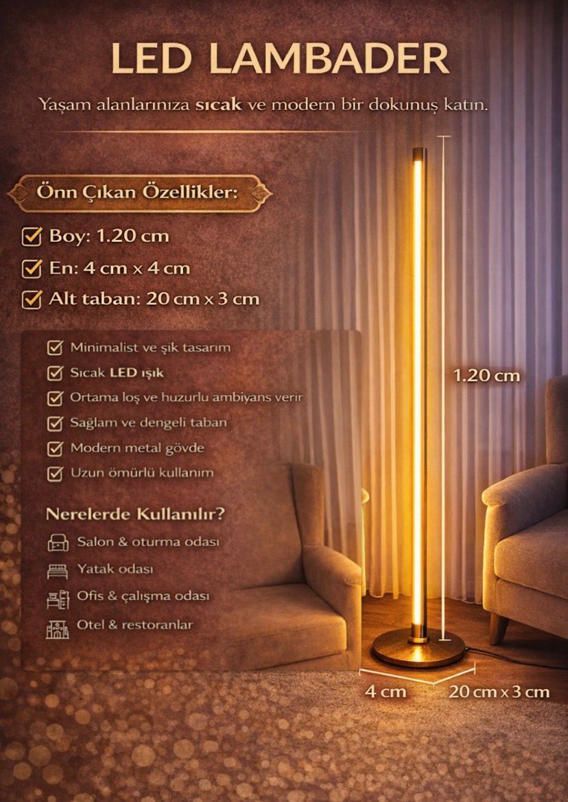 LED Lambader, yaşam alanlarınıza modern bir dokunuş katmak ve huzurlu bir ambiyans oluşturmak için özel olarak tasarlanmıştır. Minimalist çizgileri ve sıcak ışık tonuyla hem evlerde hem de profesyonel işletmelerde estetik bir görünüm sağlar. Kaliteli metal gövdesi ve uzun ömürlü kullanım avantajıyla dekorasyonunuzun vazgeçilmez bir parçası olacak bu lamba, loş ve sakin bir ortam arayanlar için idealdir.