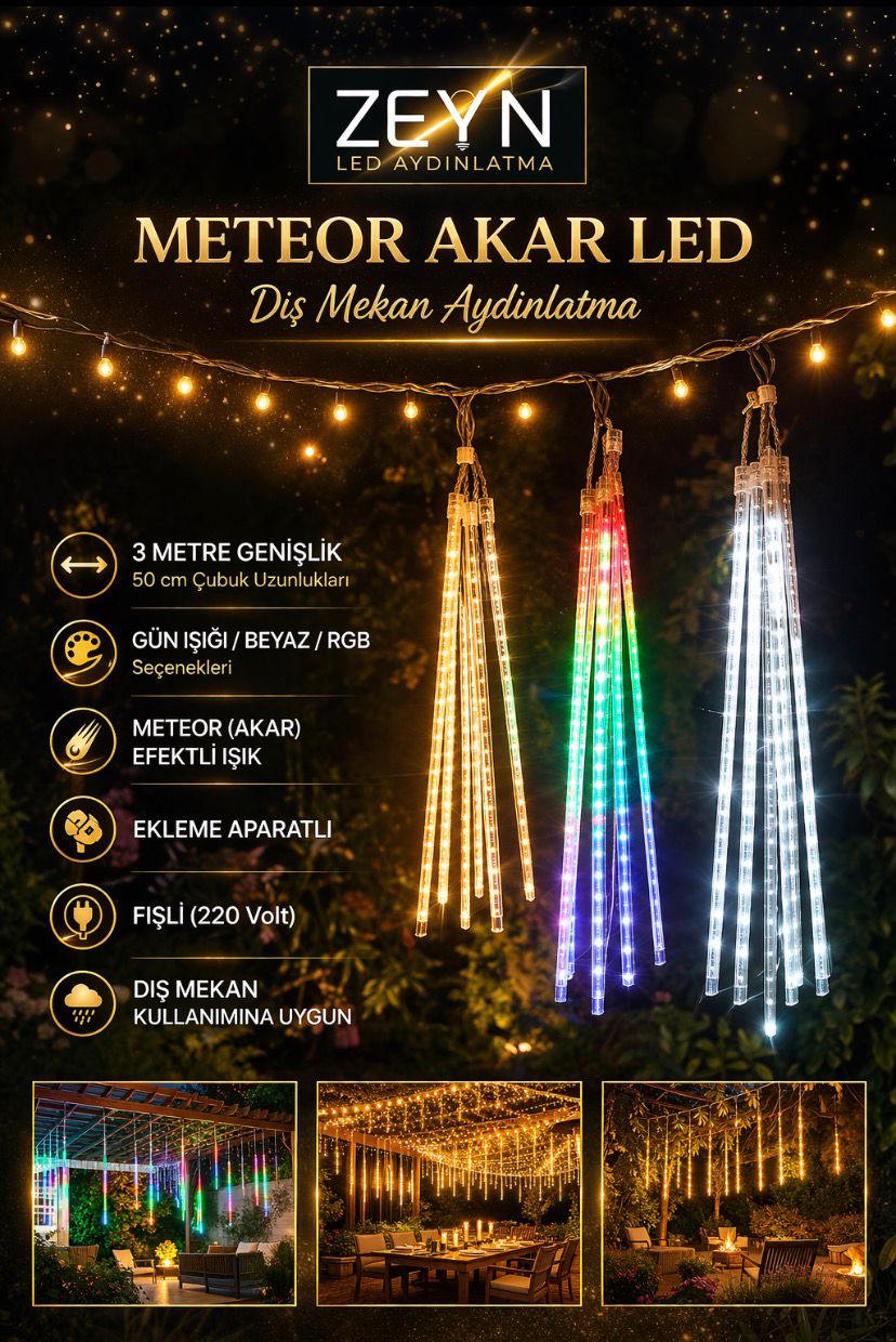 Meteor Akar LED, dış mekanlarınızda büyüleyici bir görsel şölen oluşturmak için tasarlanmış profesyonel bir aydınlatma çözümüdür. Gökyüzündeki meteor yağmurunu andıran kayan ışık efekti sayesinde bahçeler, restoranlar ve otel girişleri için eşsiz bir ambiyans sağlar. Hem modern hem de dikkat çekici bir dekorasyon arayanlar için estetik ve teknolojiyi bir araya getirir.