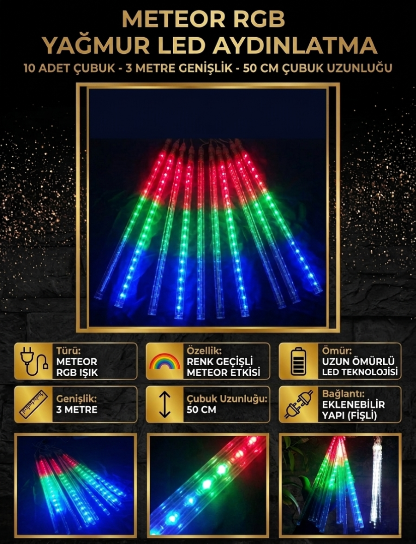 Projelerinize değer katacak ve mekanlarınızı bir adım öne çıkaracak bu benzersiz aydınlatma sistemine sahip olmak için hemen siparişinizi tamamlayın. Oteller, restoranlar, mağaza vitrinleri ve bahçe dekorasyonları için en çok tercih edilen Meteor RGB Yağmur LED ürünümüz, yüksek kalite standartlarında üretilmiştir. Stoklarla sınırlı bu özel ürünü sepetinize ekleyerek hızlı gönderim avantajından faydalanabilirsiniz.